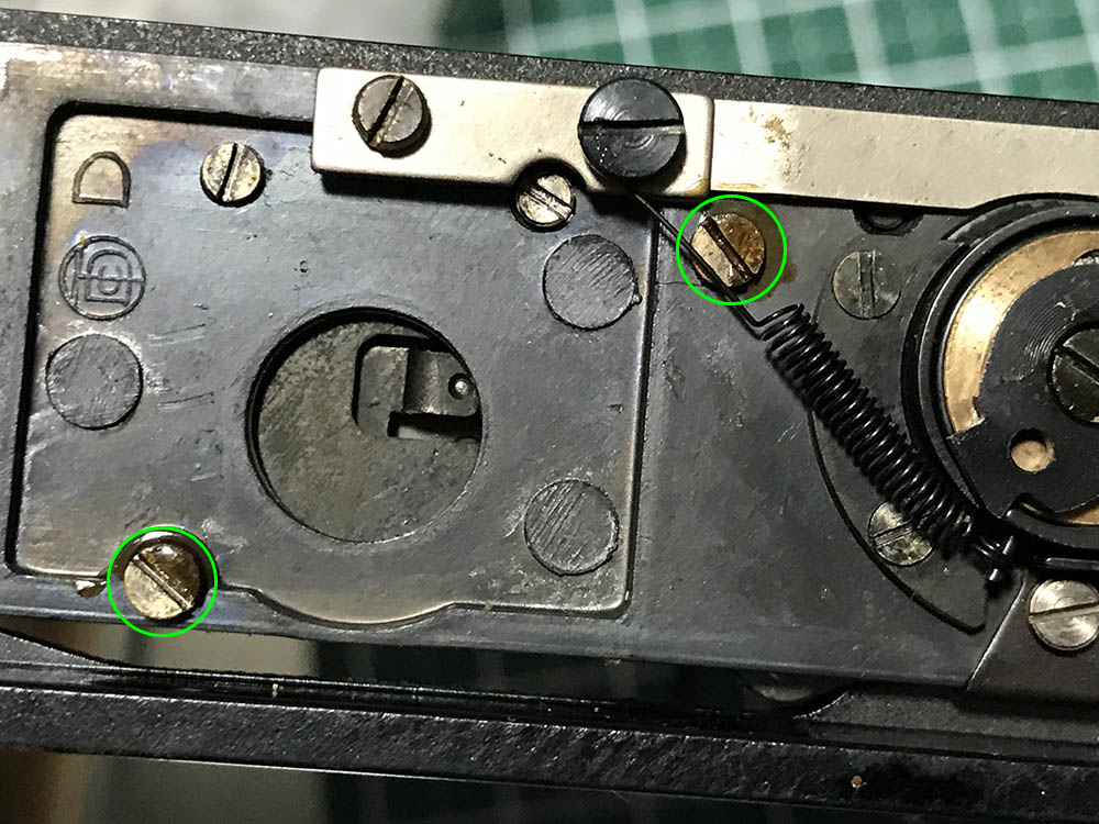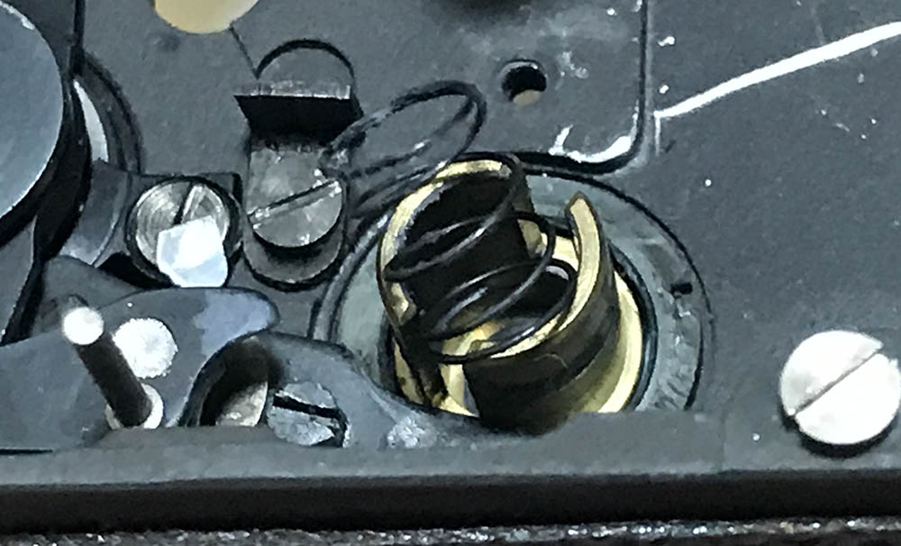 This is how it looks like underneath. Turning the dial will turn the disc with the screws. It has depressions which control how deep the slow-lever’s arm is and that’s how it controls or engages the slow-lever’s mechanism. Set the speed to anything faster than 1/15s where the slow-speed mechanism won’t have anything to do with the shutter and it automatically disengages it. This is very clever as it does this automatically when you turn the dial.