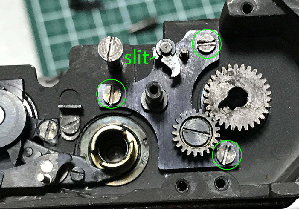 You don’t need to do this step, I just wanted to remove this because I needed to clean everything perfectly. It’s the film-advance mechanism’s gear train, I always clean this really well so it operates smoothly each time I charge the shutter. Visible in the photo is the pawl for the film-advance mechanism, it has a slit where the hook underneath the coupling gear should be placed. It is important that you don’t forget about this little detail.