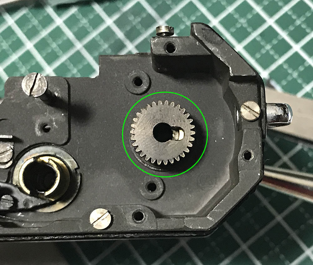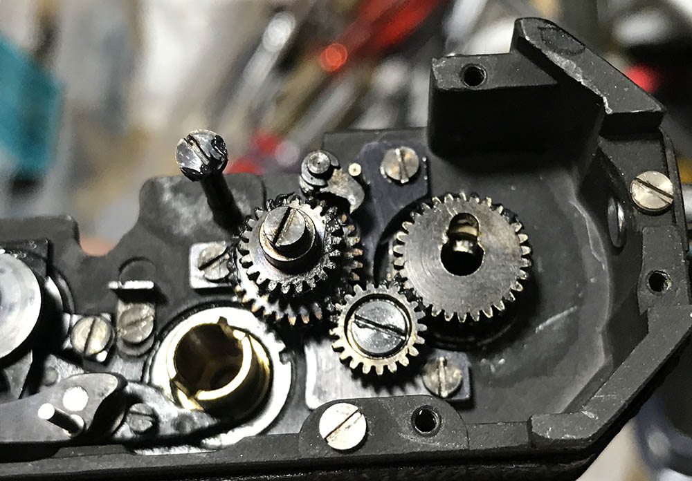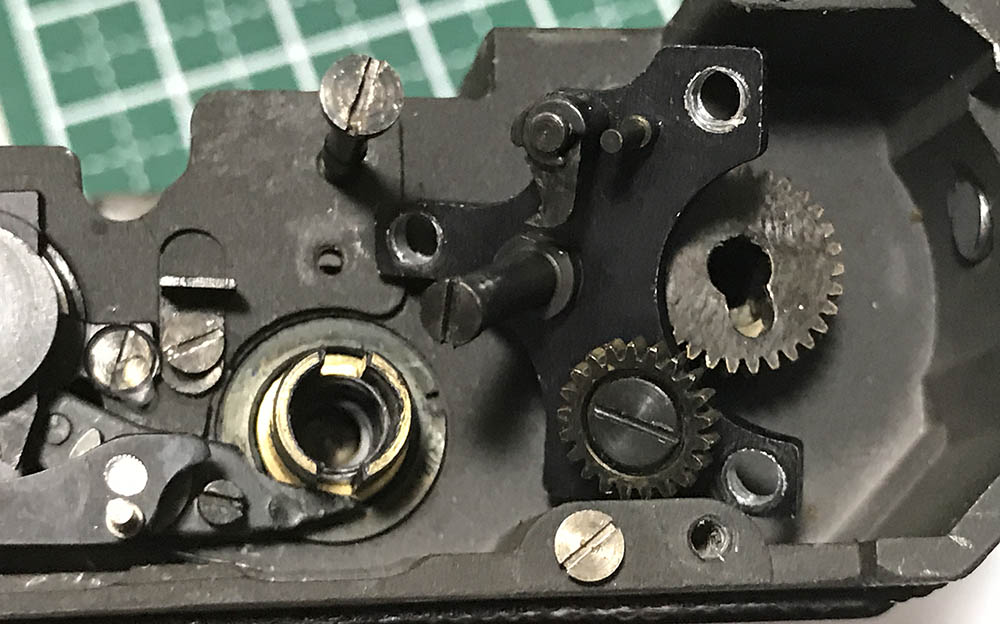Carefully remove this coupling gear. It has a tiny hook underneath it so this can connect and control the sprocket for film-advance. Without it you won’t be able to crank this in succession. It’s hard to see the hook in this photo but it’s there, it looks like a short length of bent wire over the gear.