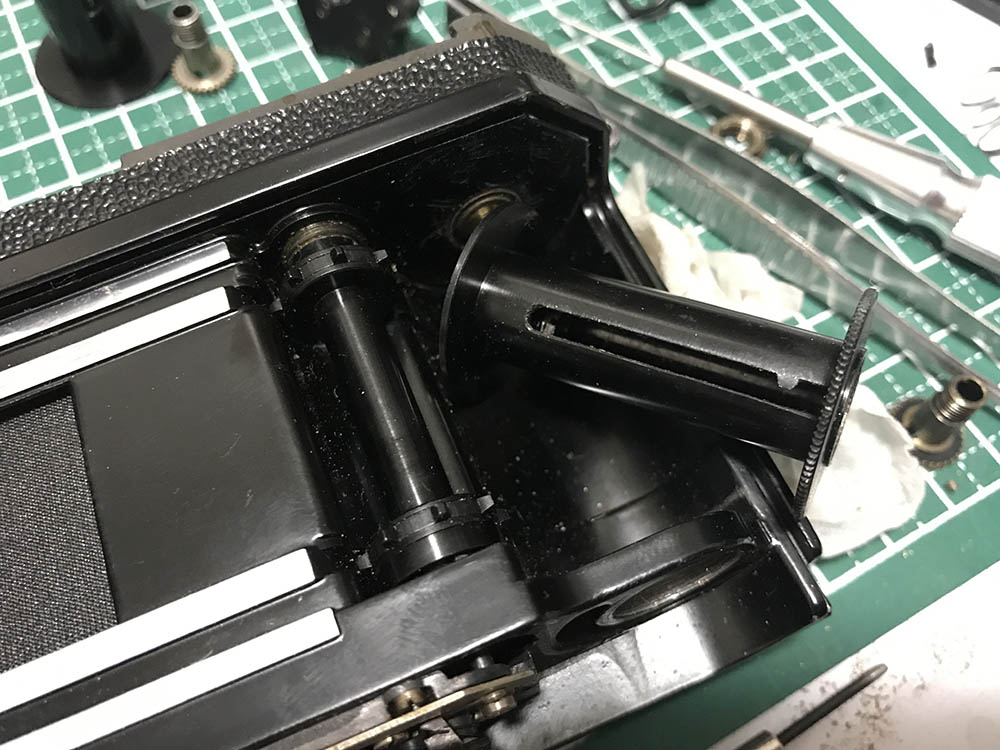 Carefully clean everything before you put anything back. Lubricate the cogs of the spool well so it turns smoothly. Once everything is gone you can clean the chassis with Q-tips saturated with alcohol. Flush any mechanisms, too. I usually avoid flushing the shutter mechanism at this point and save that for later. The shutter is delicate specially on cameras with cloth curtains. This is a very delicate job and it should be done carefully to prevent an accident.