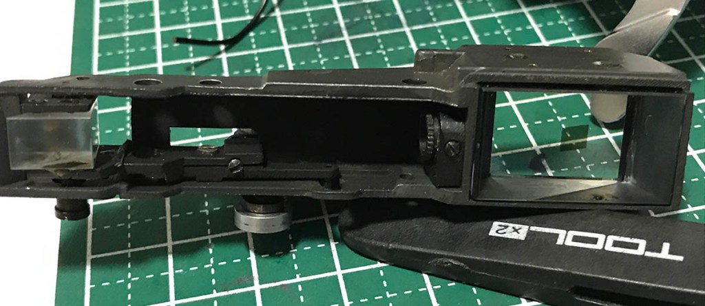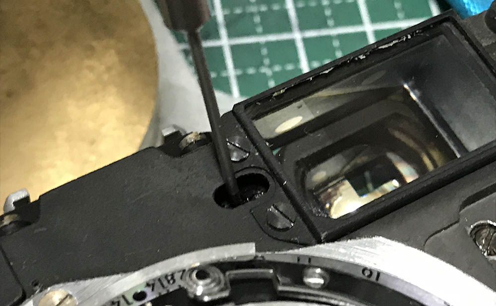 The part between the viewfinder prism and the vertical adjustment prism is impossible to clean unless you remove the vertical adjustment prism and its housing. This is a very risky thing to do and should never be done unless it’s absolutely needed. I would refuse removing it for customers’ cameras since it’s such a delicate part and its position has to be precise.