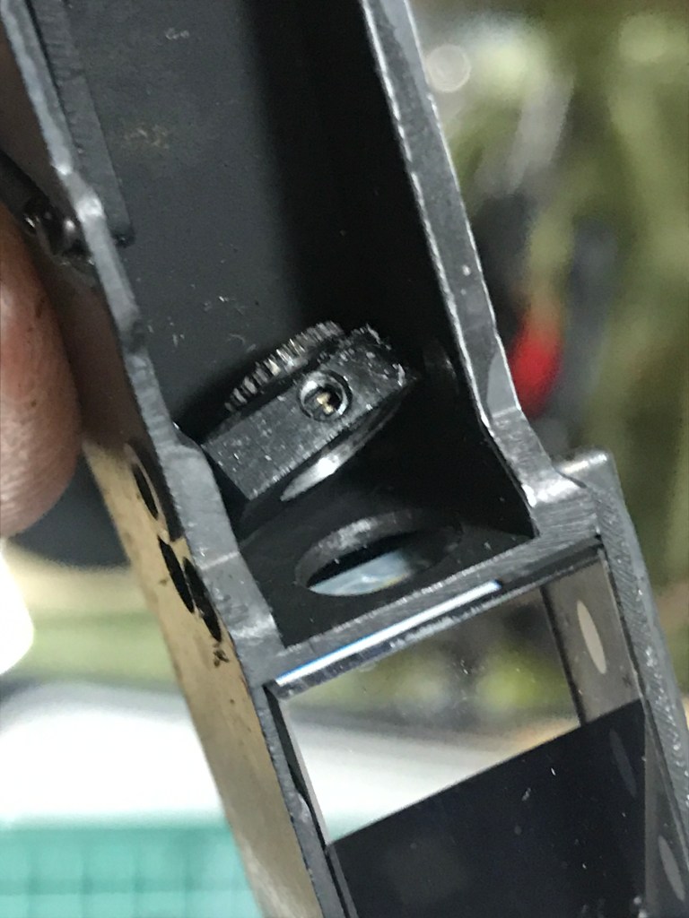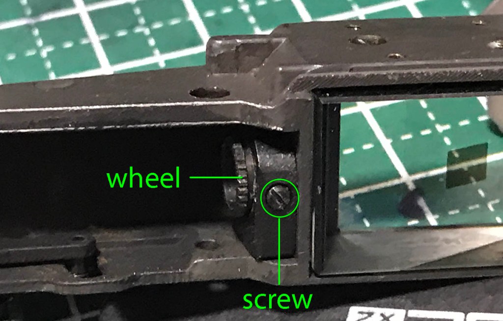 Here’s a closer view of the vertical adjustment prism’s mechanism. The set screw secures the wheel, loosen this screw a bit and you can turn the wheel up-or-down to adjust the vertical alignment of the rangefinder patch. Don’t turn the wheel too much and never over-tighten its set screw.