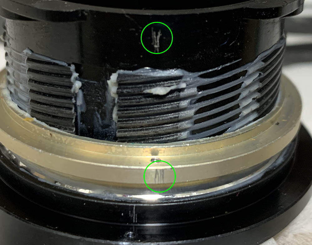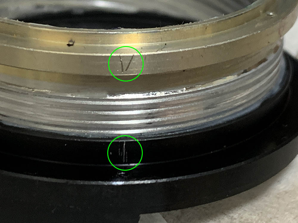 Once the helicoid keys are gone you can proceed to separating the helicoids. Don’t forget to mark where they separated, small marks are enough. I made mine too-big only because this lens belongs to me. Please read my article on how to work with helicoids, many people get stuck here because they do not know how to service these properly, reading my article will educate you on how to work on these. Basically, you’ll want to mesh them at the exact place where they separated. I start be separating the inner helicoid, look at all the grease applied to it, it’s the type of cheap lithium grease used for lubricating toilet fixtures.