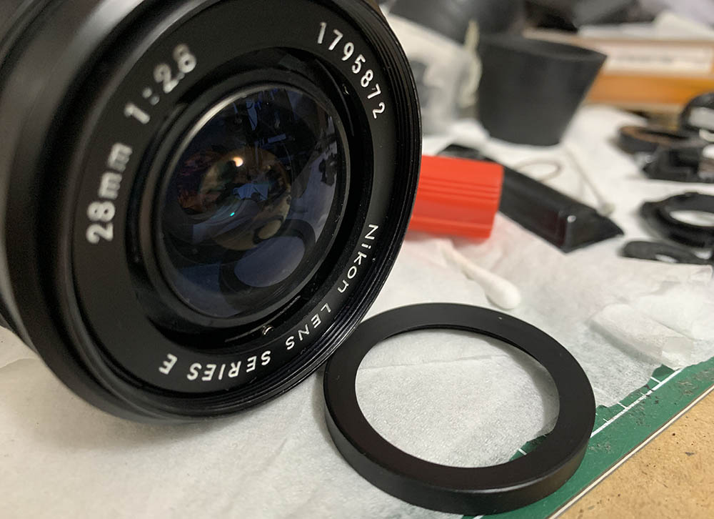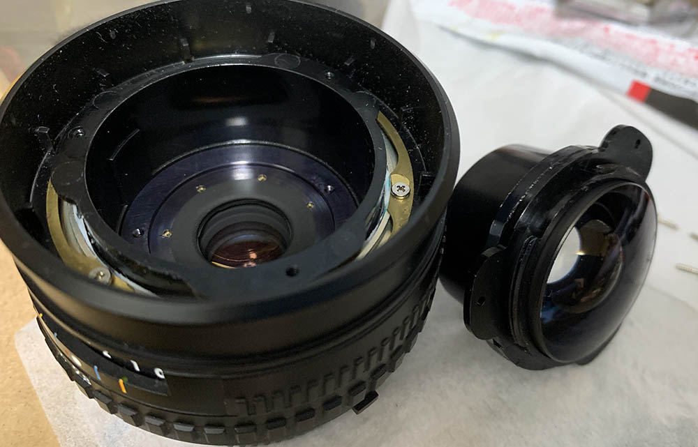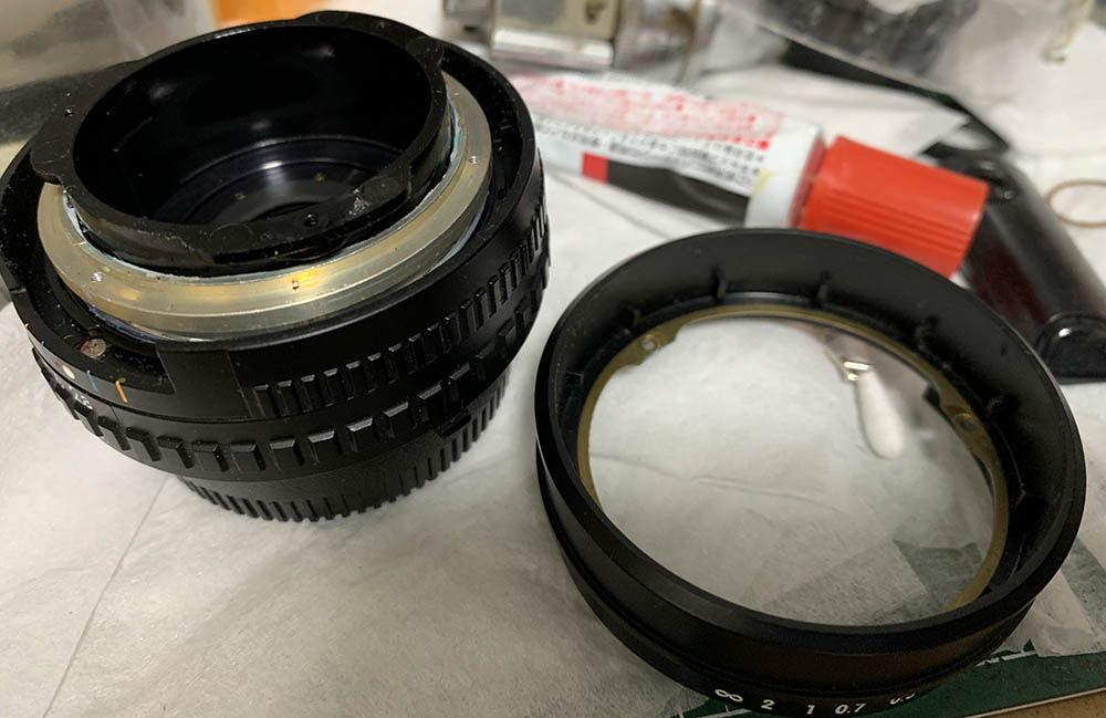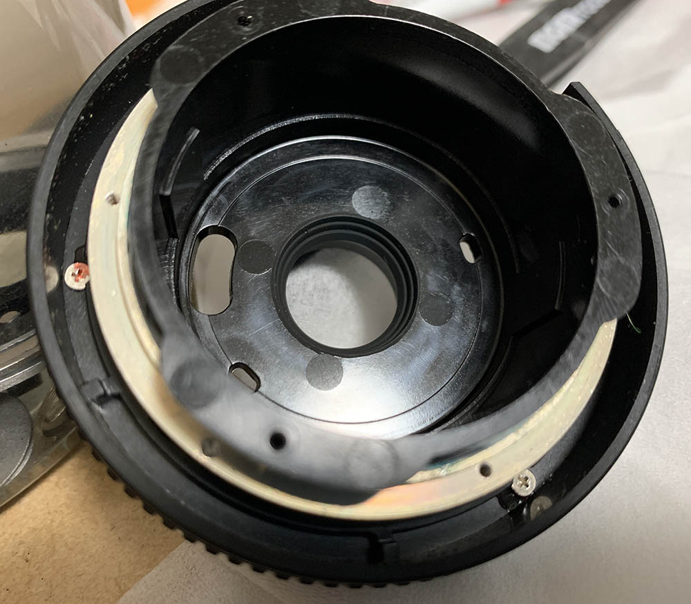 The front barrel can now be removed. While it’s made of metal it still feels a lot cheaper than what we’re normally accustomed to in true-blue Nikkors.