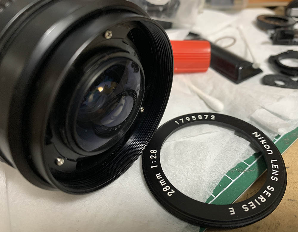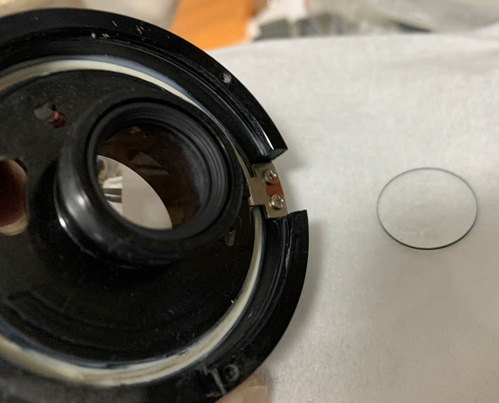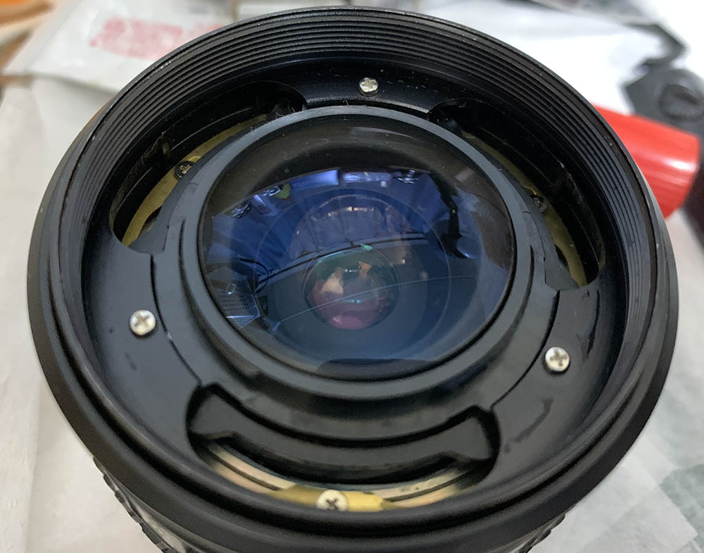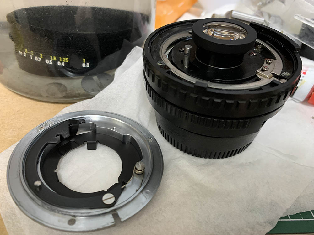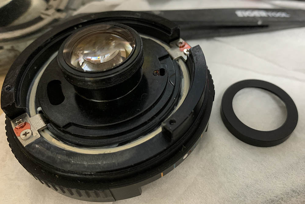 Look inside the objective’s housing and make a small mark so you will know how to put the iris mechanism back again. This is an adjustable part, do not forget to put it back the right way or you won’t proper exposure readings.