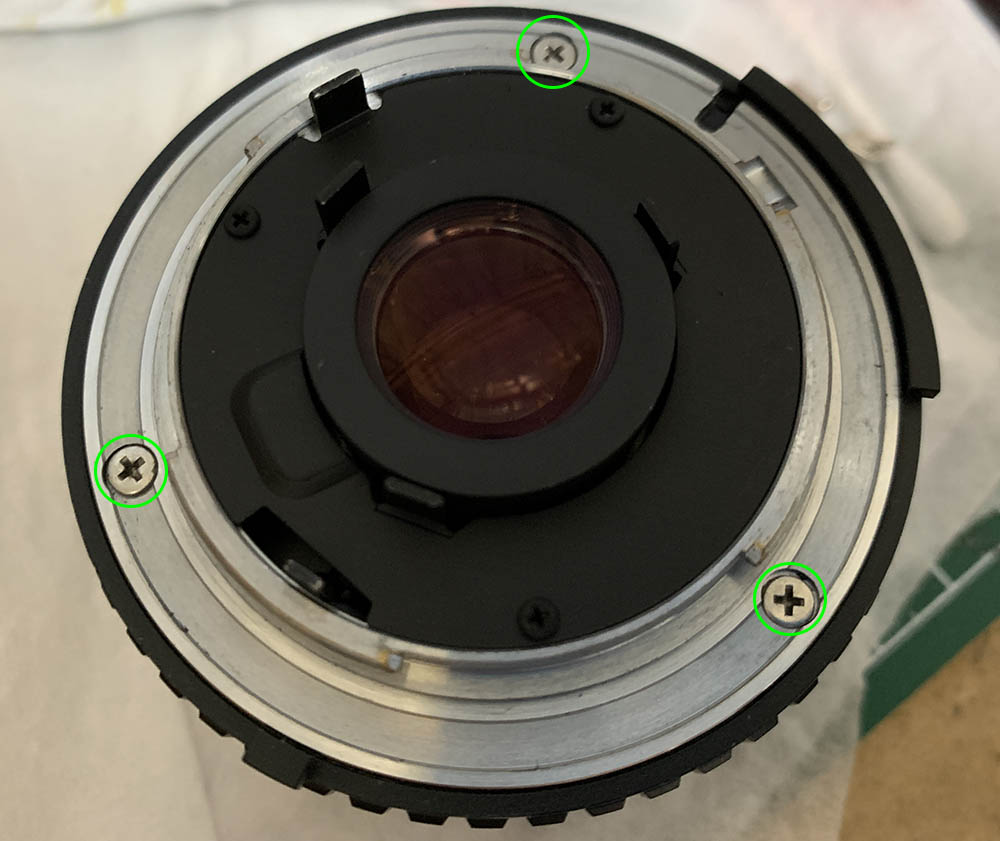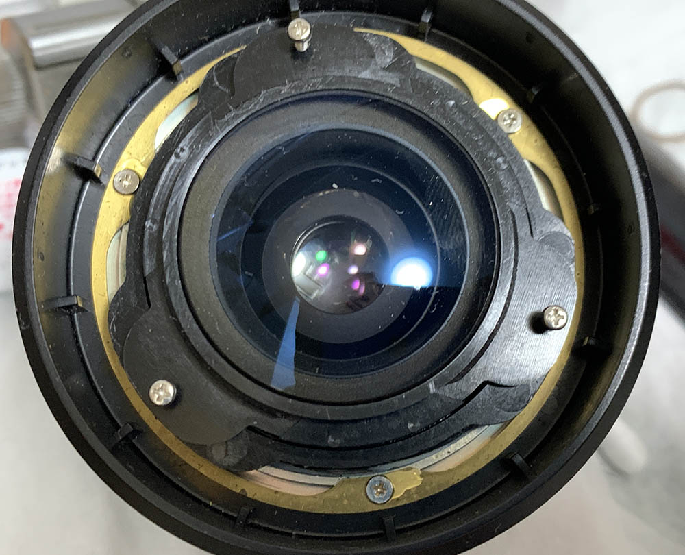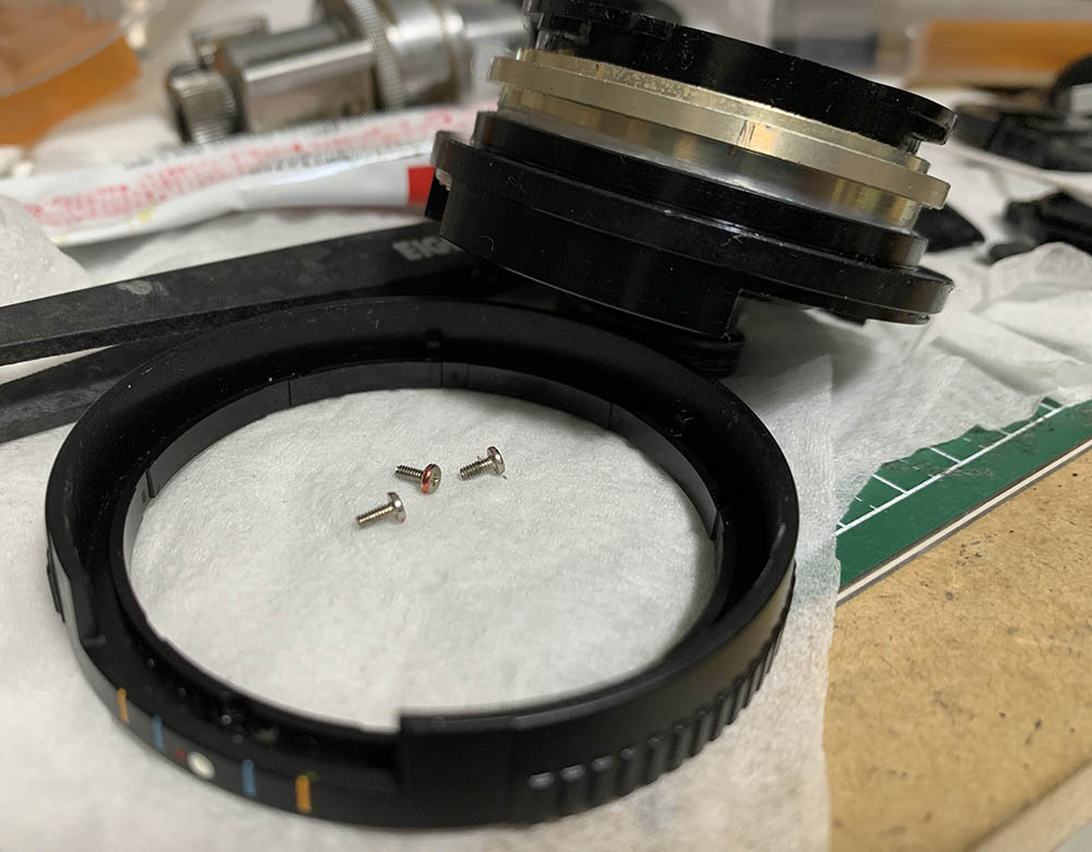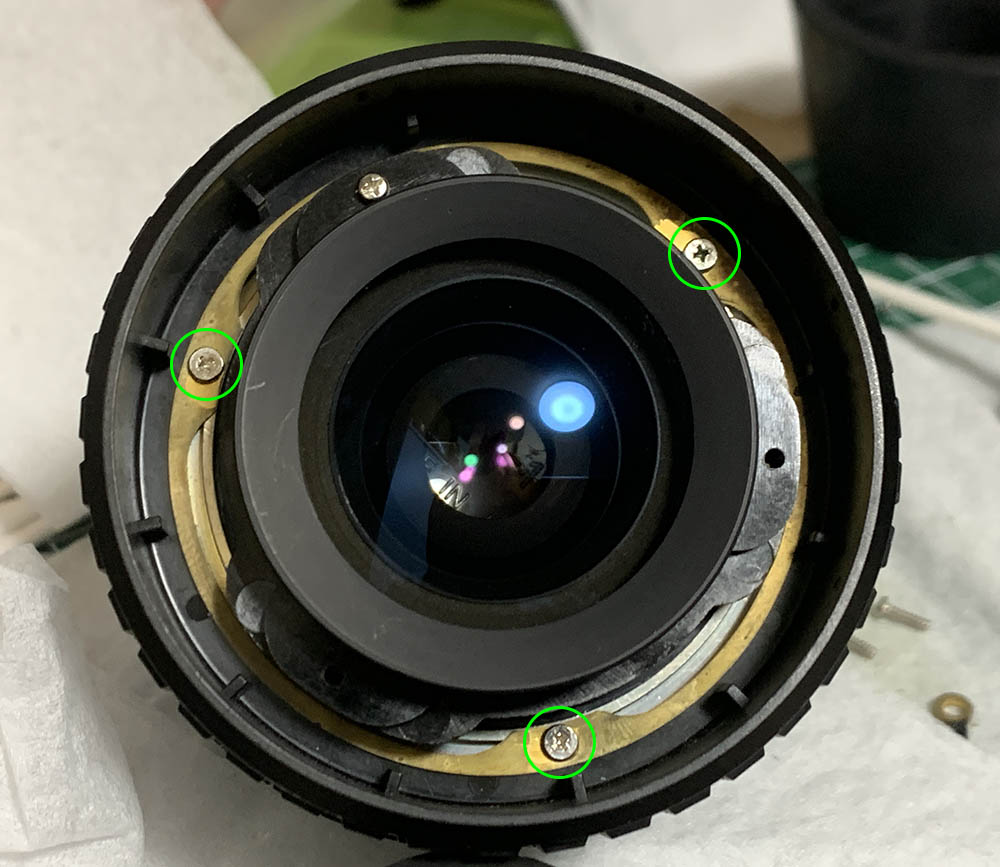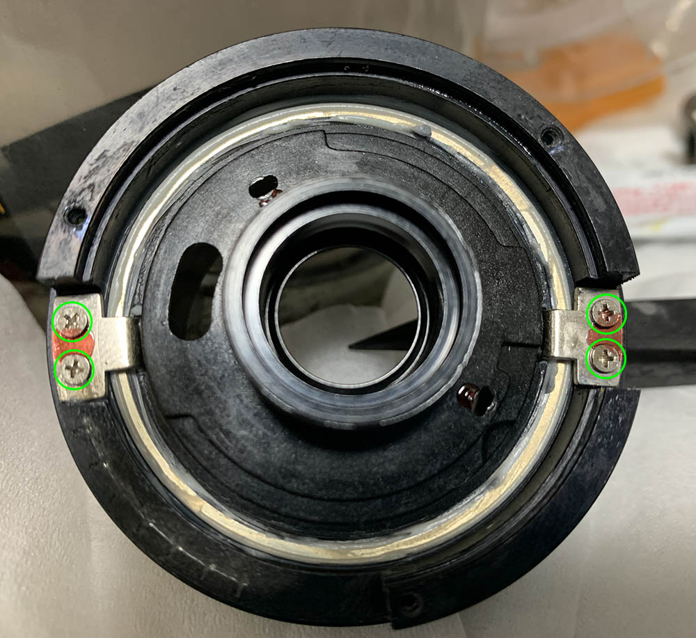 You’ll see 2 screws at the base of the objective’s housing, these screws secure the iris mechanism. Don’t remove these until you’ve made some marks.