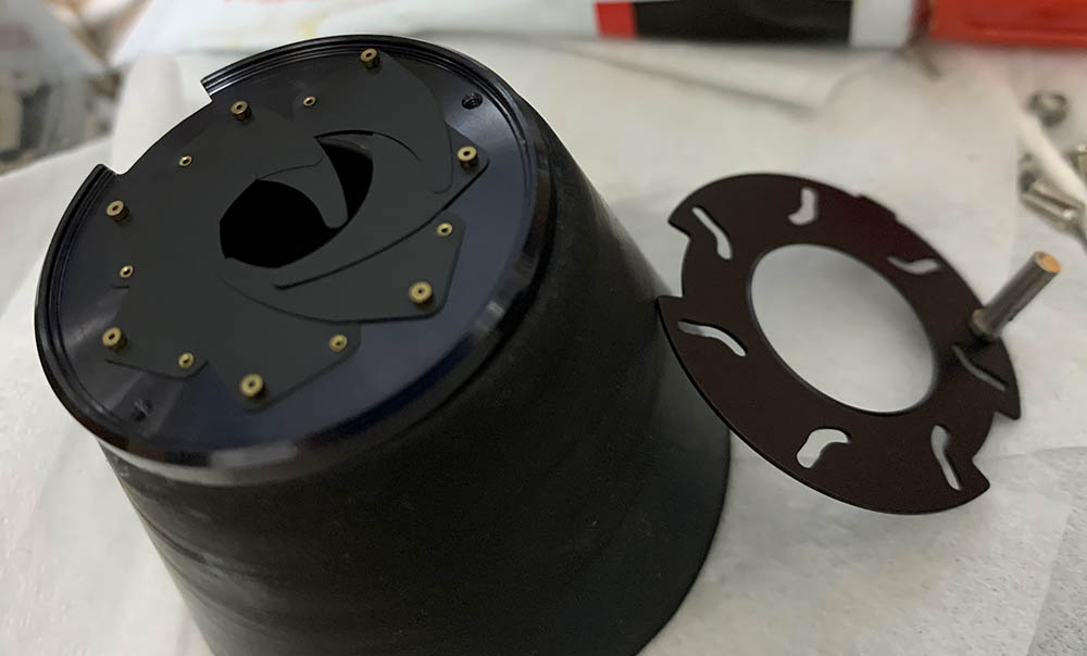 To remove the helicoids you’ll need to extract these screws. The helicoid are secured by these keys, they keep the helicoids’ turn synced. You will want to mark one of the helicoids so you’ll know which key goes to which slot. They were broken-in to their slots and you’ll want to put them back again in their proper slots. Before you remove these, take lots of notes or measurements. I always take plenty of photos before I remove these, the photos will help me determine if I have meshed the helicoids properly.