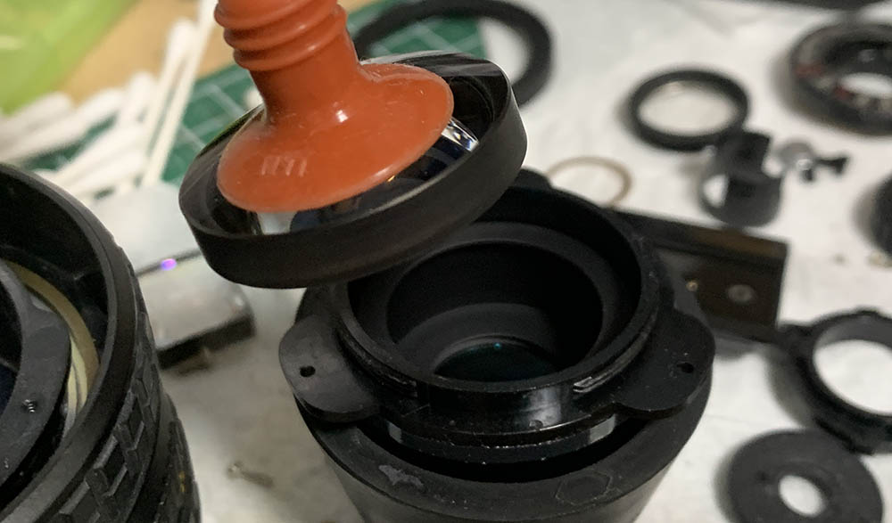 You can remove the front element with a lens sucker once its ring is gone. It is a convex lens so it’s easy to note its direction. Leave the 2nd element it its housing, I don’t see the need to remove it.