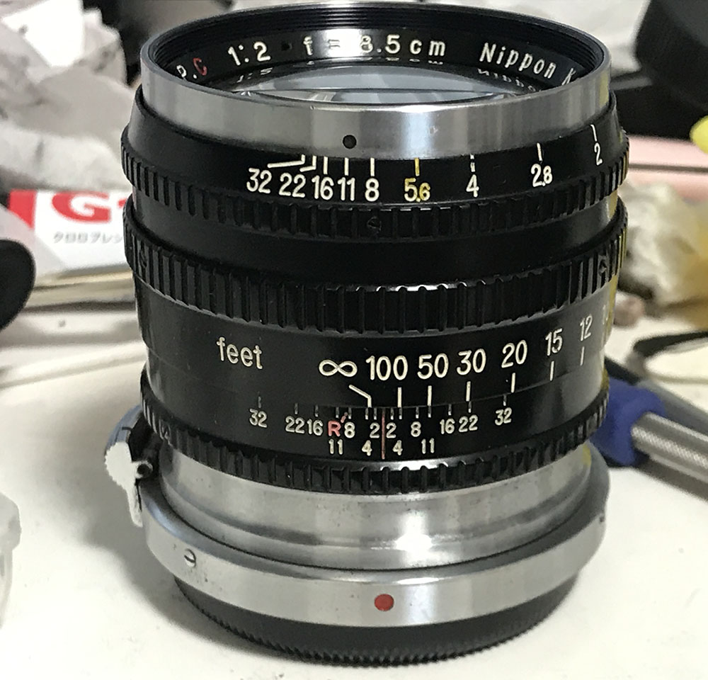 At the same time the “·C” designation was dropped (or a little after on some lenses), Nikon changed the font for the engraving on the lens. For example, the old font has a “3” with a flat top, the newer font has a rounded top. The newer font continues to be used for F-mount Nikkors right up to Ai-S lenses still made today. However, the Nikkor-P.C 8.5cm f/2 uses the old one even for the late black series, except for a few very-late lenses such at the one shown in this page, the latest serial number I have seen. Even that has its front ring engraved with the old style font, but it has the new font on the distance and aperture scales.