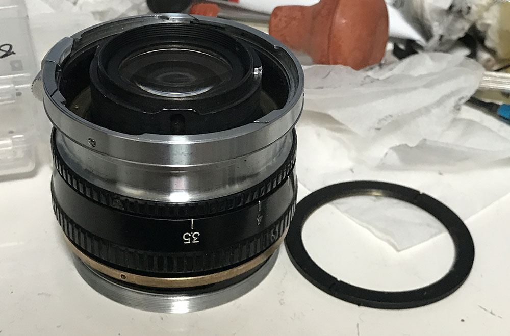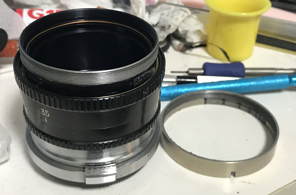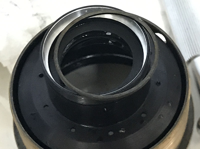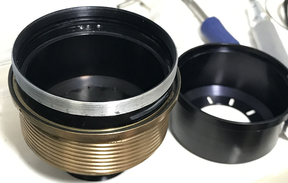 Finally, it’s now time to remove the objective’s housing. Mine was stuck and I had to pickle this in an alcohol bath for days before I was able to remove it from the inner helicoid. Before doing so, I took a picture just to make sure I could determine how much this should be tightened.
