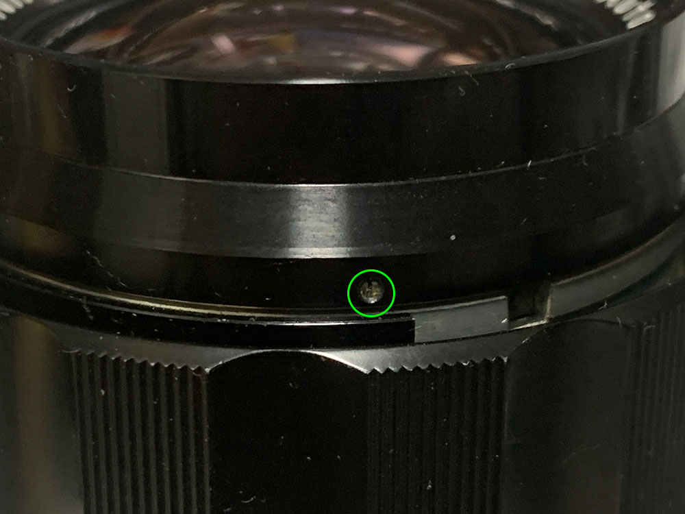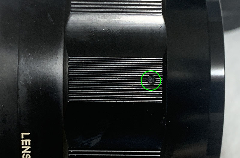 Locate and loosen this, you may have to turn the focusing ring to access this screw. It secures the front barrel which in turn secures the objective. Once it is loose, turn the focusing ring to infinity and unscrew the front barrel. You have to turn the focusing ring to infinity so you’ll have a point-of-reference, you’ll know what I mean in the next couple of steps.