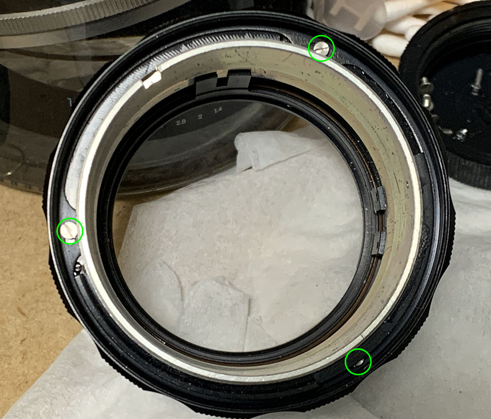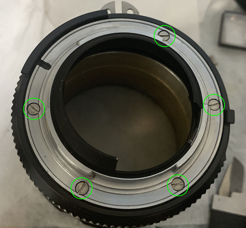 Carefully extract these. You should heat these well before you remove them or saturate them with alcohol first. Nikkors from this era are known to have plenty of glue used on their screws and this is one of them. If you’re new to lens repair, read my article on how to remove bayonet screws. Many people get stuck here because they stripped the heads of these because they aren’t using the right tools or may not have the right skill. Read and follow what I said in my article and you should be fine.