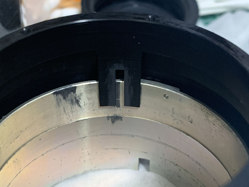 This is the aperture fork, it couples to the iris mechanism. There’s traces of grease here, something that I will never do. If I had to apply grease here I’d only apply a very thin film so any excess grease won’t migrate to the iris.