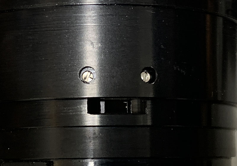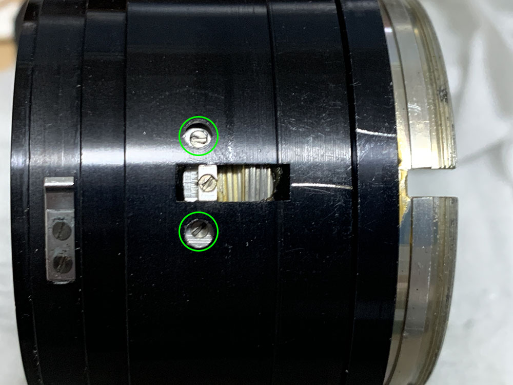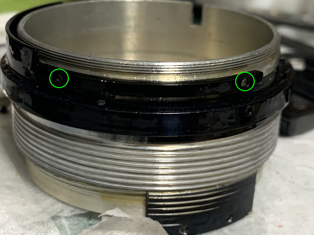 Locate and extract these so you can remove the helicoid key. The key is used for syncing the helicoids so they’ll turn at the same rate, enabling the barrel to extend or retract. These screws are usually cemented, apply heat through the other side to soften the thread-locking compound before you extract the little screws.