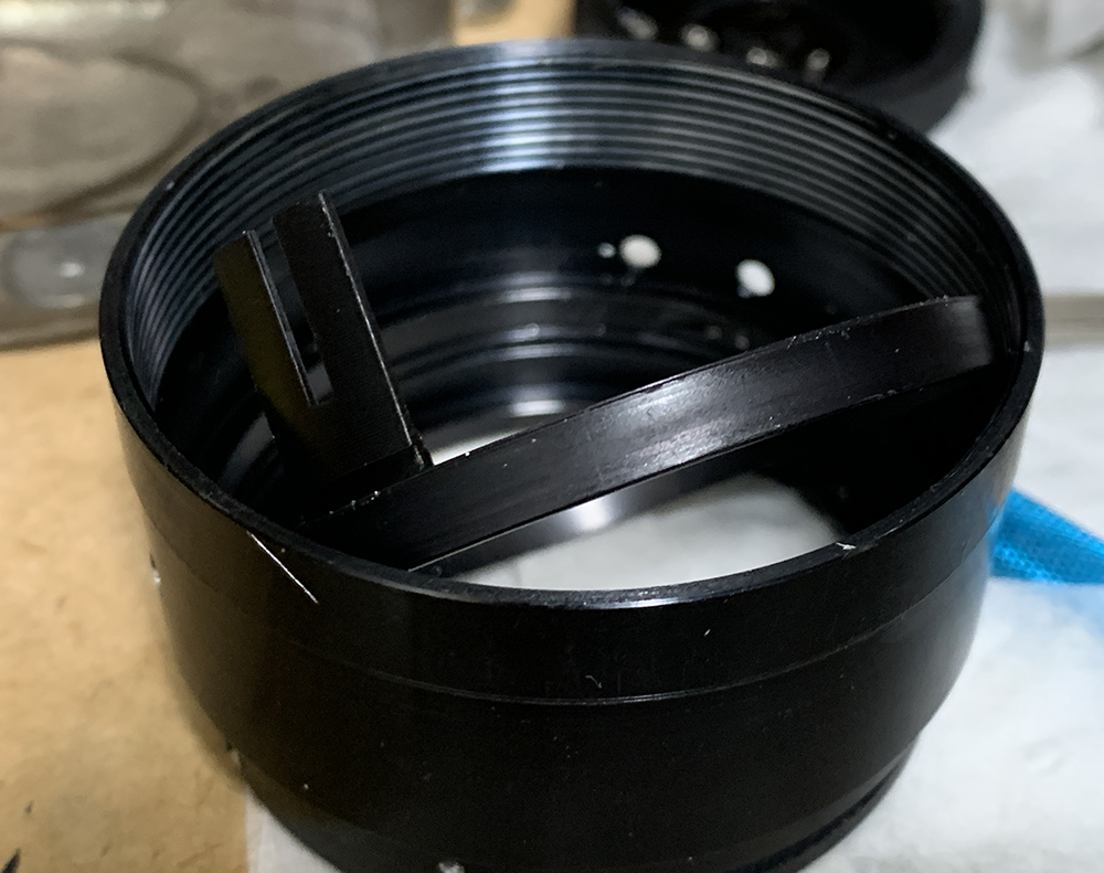 Now’s the time to take the lower barrel apart. Remove this brass ring so you can remove the aperture fork and its rail.