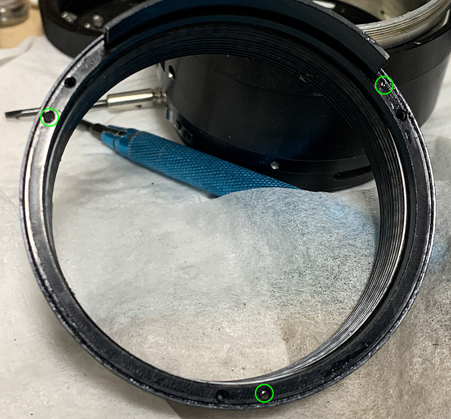These screws secure the focus-adjuster ring. The ring and these screws are all sealed, pickle the whole assembly in alcohol for a night and get back to it the next day. Once the seals have been dissolved, loosen these to remove the ring but before you do that, take notes or make some marks so you’ll know how to put this back again later.