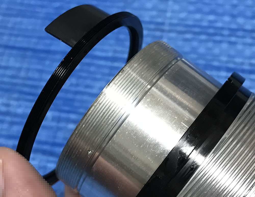 You can remove the focus adjuster ring by loosening these but before doing so you should note its alignment first so you’ll know how to put it back later properly. These rings are usually sealed with cement, the safest way to get it off is to saturate it with strong solvents like MEK. You should apply it until it is able to turn without any effort, it may even take you a day or more. Apply a couple of drops and repeat that procedure several times a day.