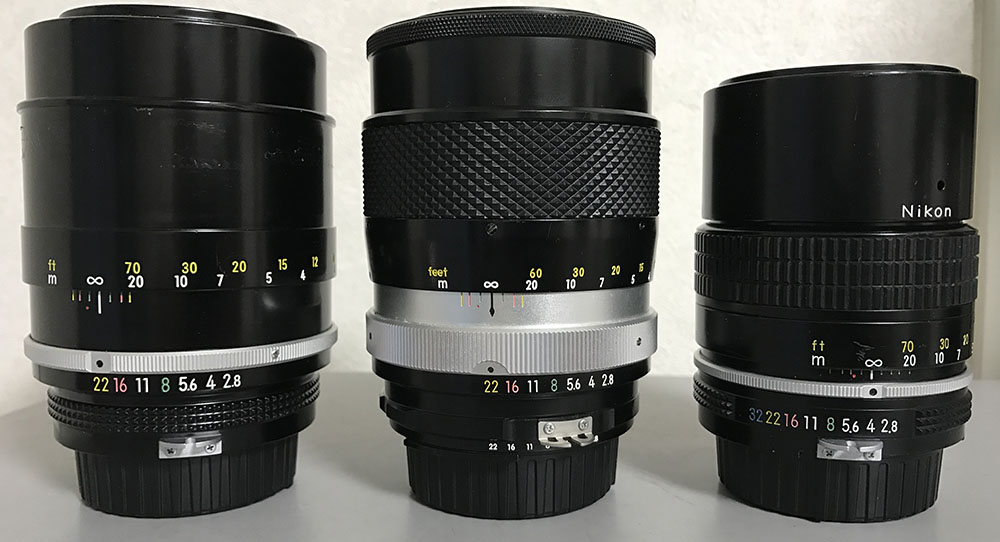 Here it is together with the Nikkor-Q 135m f/2.8 Auto and the second model of the New-Nikkor 135m f/2.8. Its dimensions are nearly-identical to the old Nikkor-Q 135m f/2.8 Auto but they don’t share the same factory-supplied Ai-ring. In fact, I’m not even sure if there are any interchangeable parts. There may be some things that are common between the 2 models but do not take my word for it.