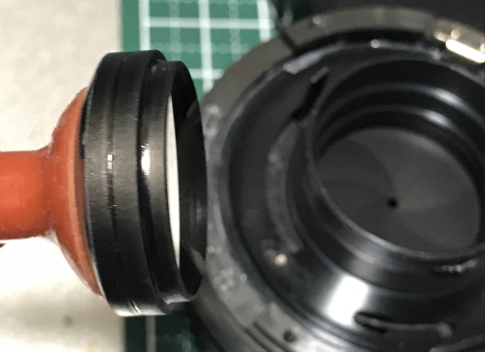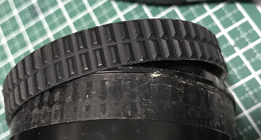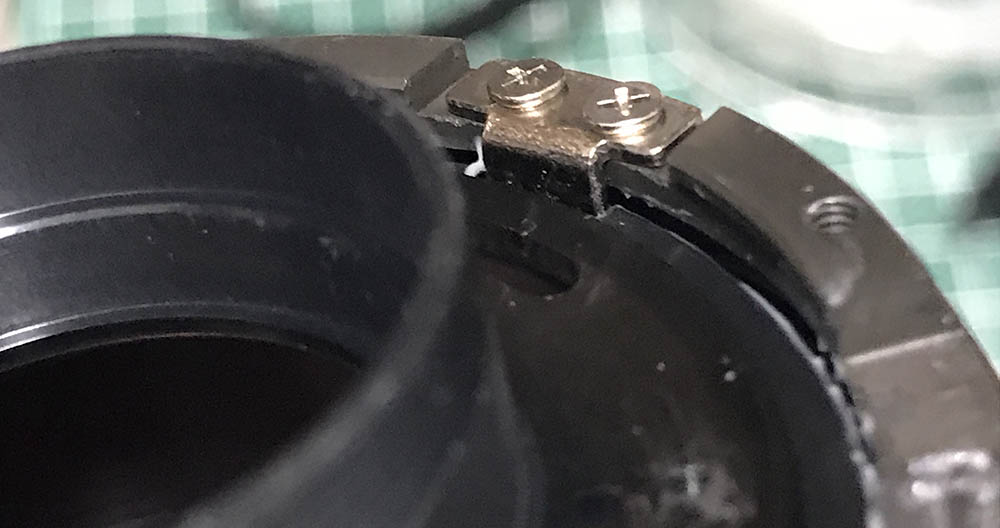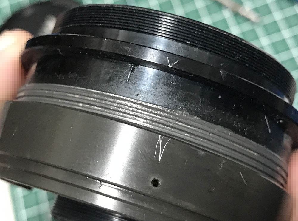 You can remove the depth-of-field scale and the grip by extracting these. It’s important that you take plenty of notes and photos so you’ll know how the barrel is when it’s focused to infinity so you’ll have a point-of-reference. It’s quite shallow but you’ll see small scratches made by me in the photo to help me determine its alignment at infinity.