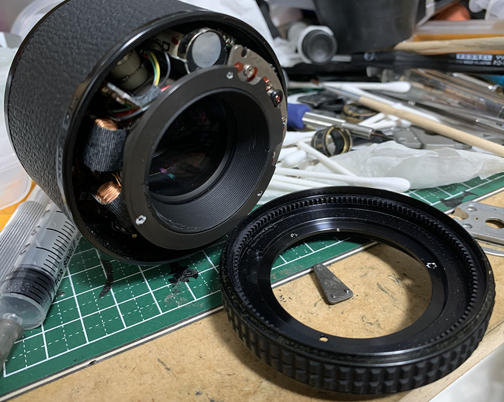 You won’t normally have to open this lens up like you would a manual-lens but there may be times when you would need to do so such as when there’s fungus in the elements or the rear elements are fogged with grease and oil. It’s important to only remove the trouble parts and leave the rest alone. It’s not wise to touch something that’s working, that’s stupid. You’ll have to be a bit careful when handling this lens since there are electronic parts within it and you could brick the lens with static electricity from your hands. It’s best to always work with this while the focus is set beyond-infinity so you’ll have a good point-of-reference when you reassemble it. Take plenty of photos, it’s mandatory for any kind of repair.