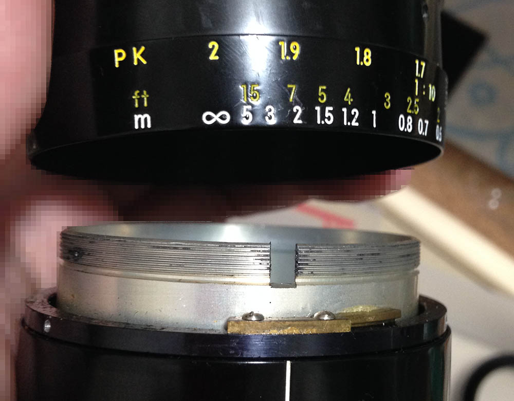 Once the screws are gone you can safely remove the focusing ring. Scratch a mark on the lip of the central helicoid where the focusing ring was attached so you’ll know how it should be aligned when the barrel’s turned to infinity. This will help you determine if you got it right later during reassembly. The mark doesn’t need to be big, even a small scratch is enough so long as you’ll be able to see it properly later.