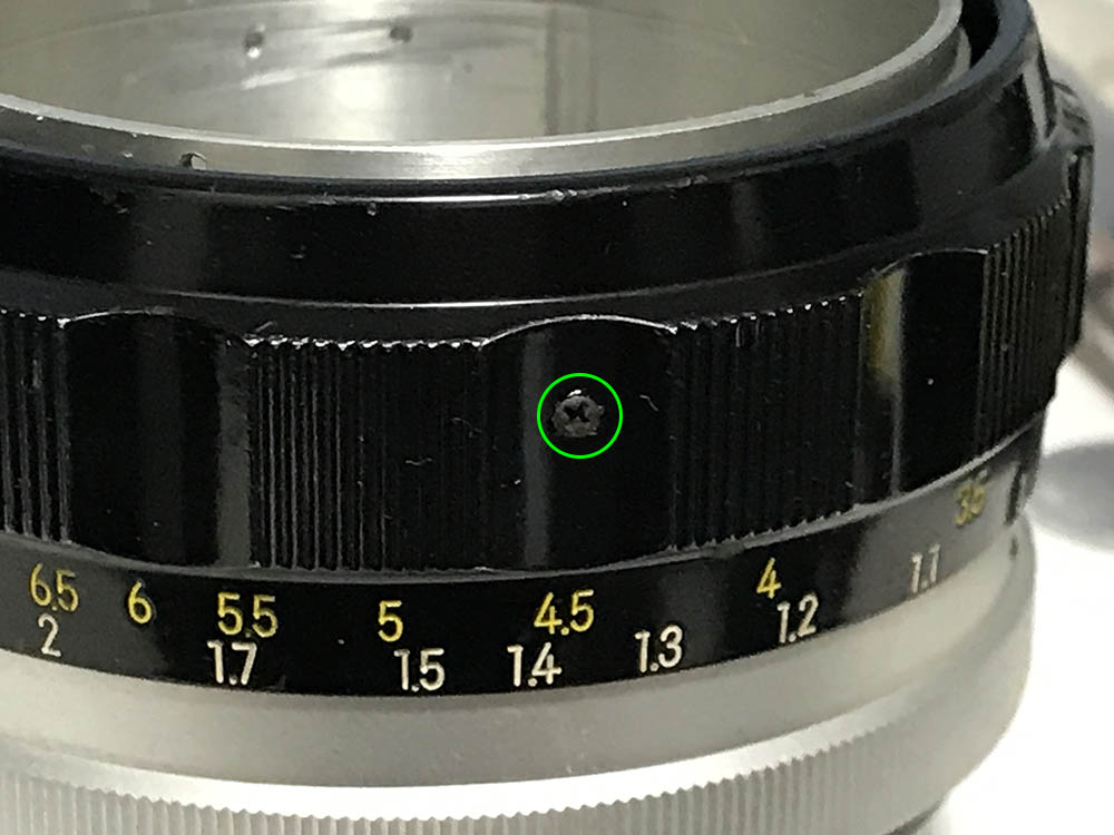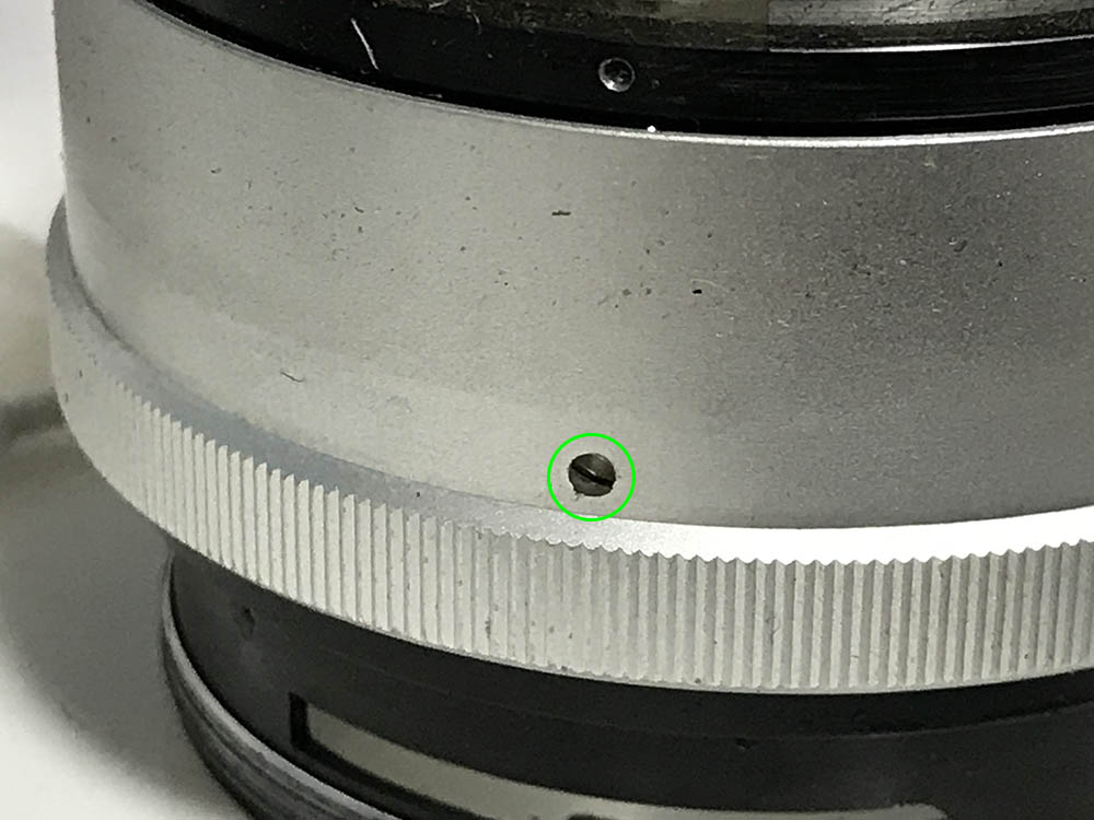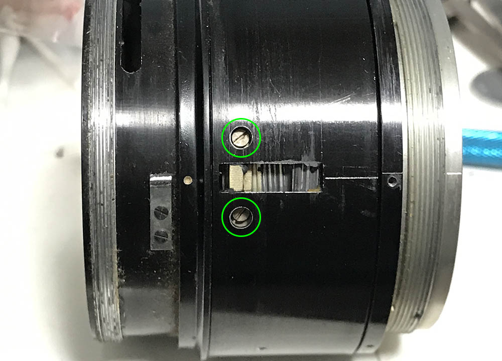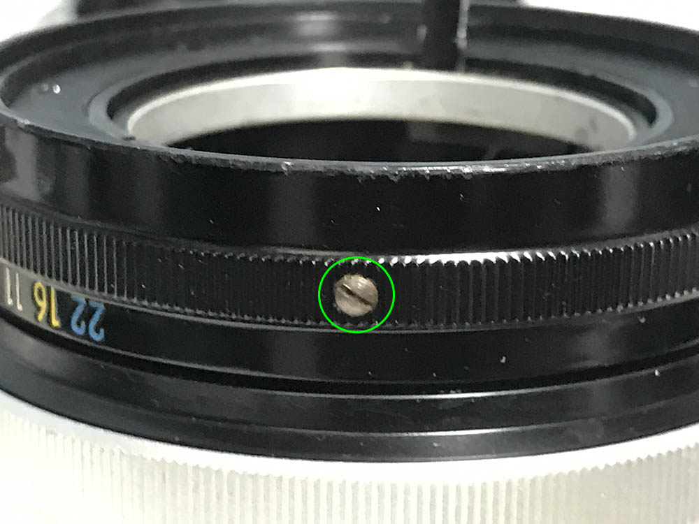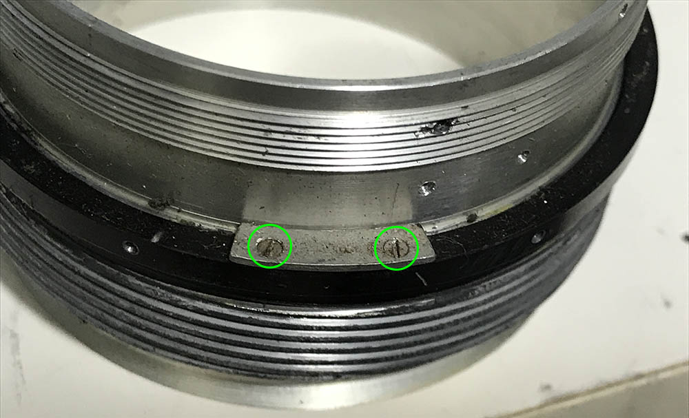 This screw has to be removed in order to safely unscrew the aperture ring. It’s used to link the aperture ring to the aperture fork inside. This enables it to control the iris within the housing of the objective.