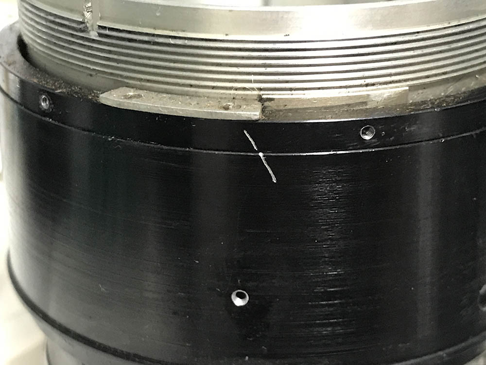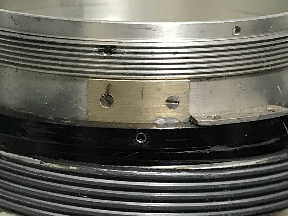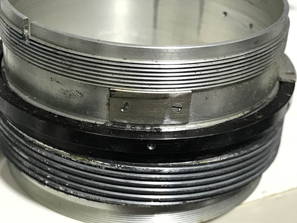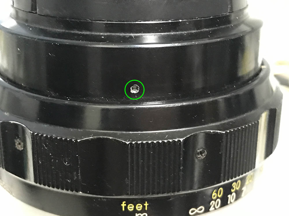 This screw has to be removed in order to safely unscrew the aperture ring. It’s used to link the aperture ring to the aperture fork inside. This enables it to control the iris within the housing of the objective.