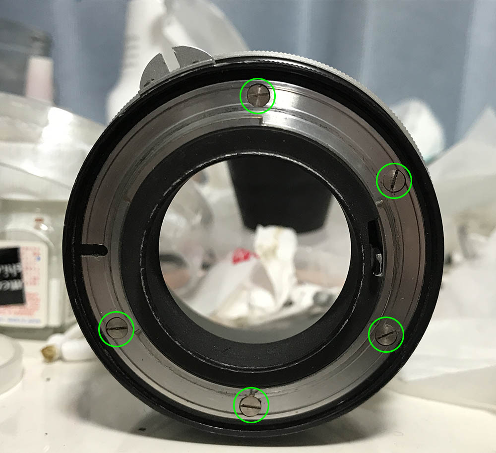 Now that the sleeve is gone you’re able to access these port holes. You could see the screws of the helicoid key through it. The helicoid key is responsible for syncing the rotation of the helicoids so they all turn at the same rate. It’s what enables the barrel to extend or retract. Before you remove it, take lots of photos and notes of the helicoids’ alignment when the barrel is at infinity so you will know how to put them back. This lens was serviced before and it has been marked by the previous repairer so I don’t have to do it. Once you are satisfied with your notes, extract the screws so the helicoids could turn-freely. This will allow you to separate them.