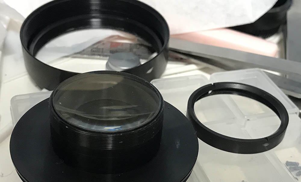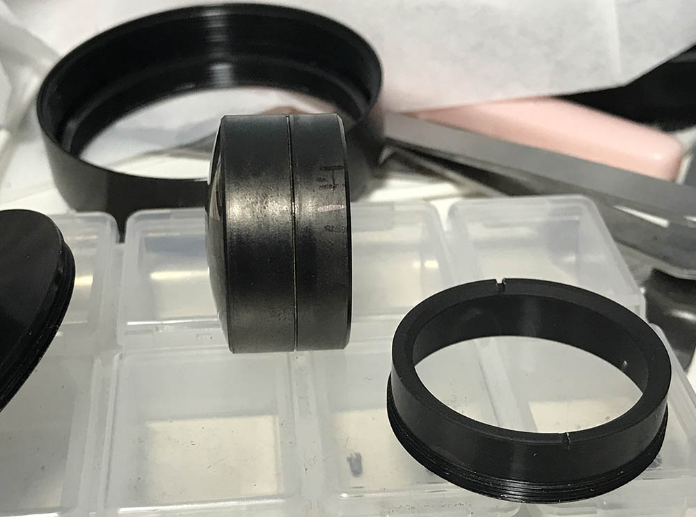 Extract the objective, store it in a safe place while you work with the barrel. This is heavy, don’t drop it. Note that there’s a brass shim underneath it, it’s used to calibrate this lens’ focus so don’t loose or warp it.