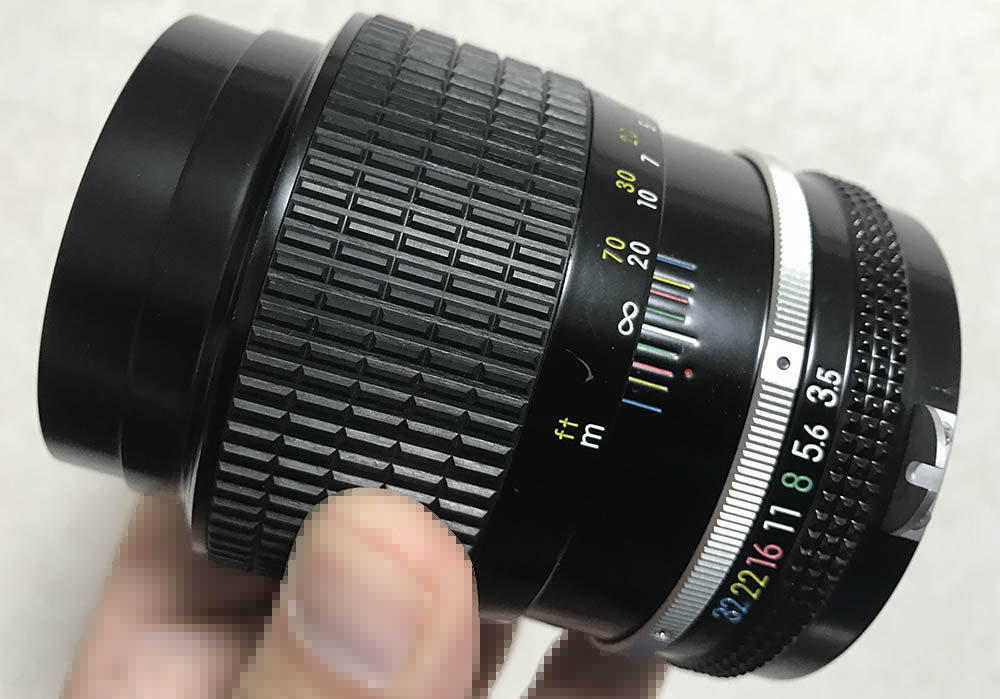 It feels dense when held, the wide focusing ring is easy-to-hold and you can turn it precisely. The focus-throw is a bit long which is typical of this family of lenses. This one doesn’t have the factory Ai-ring installed, you should not use it with modern Nikons that have an Ai-coupling tab that can’t be lifted-up or you’ll damage the camera.