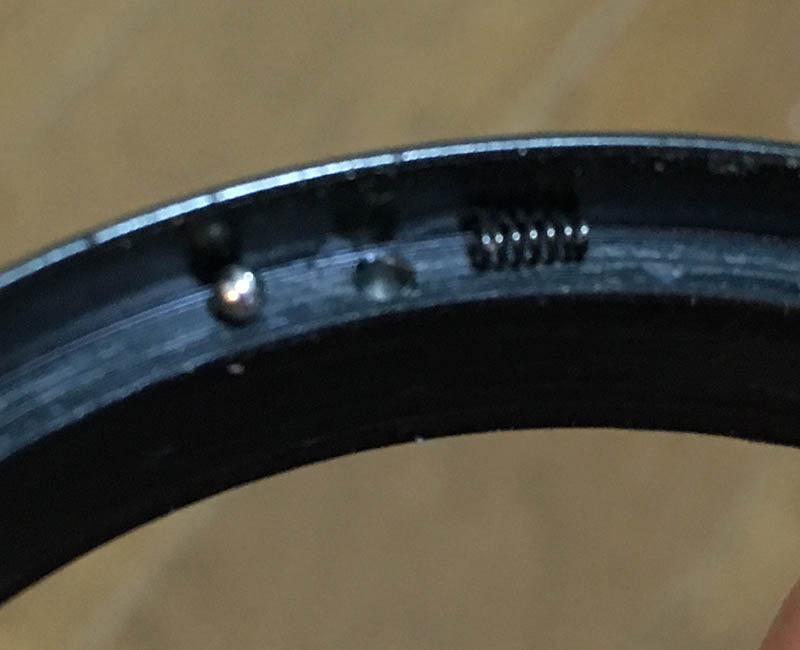 Be careful when removing the aperture ring, there’s a tiny ball here and it’s spring-loaded. The little parts here can be misplaced quite easily. Clean this part carefully.