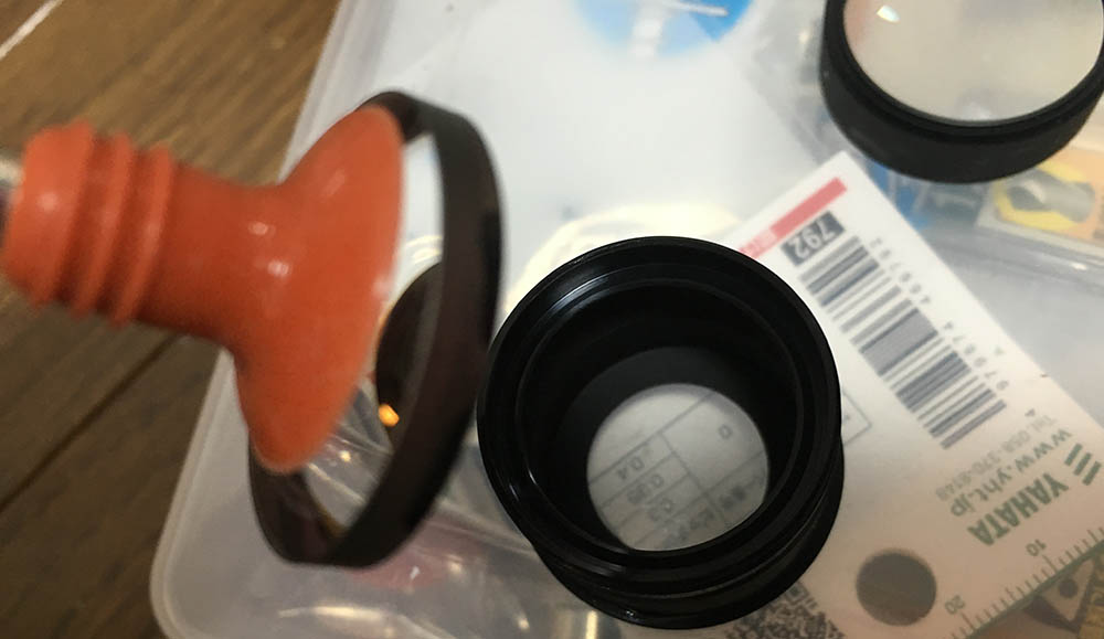Remove the rear element and its housing by unscrewing it. If it’s stuck, use a bit of acetone to soften the seal.