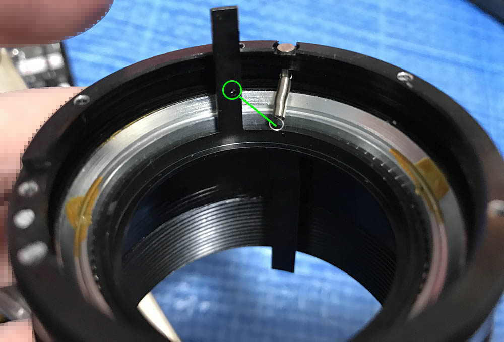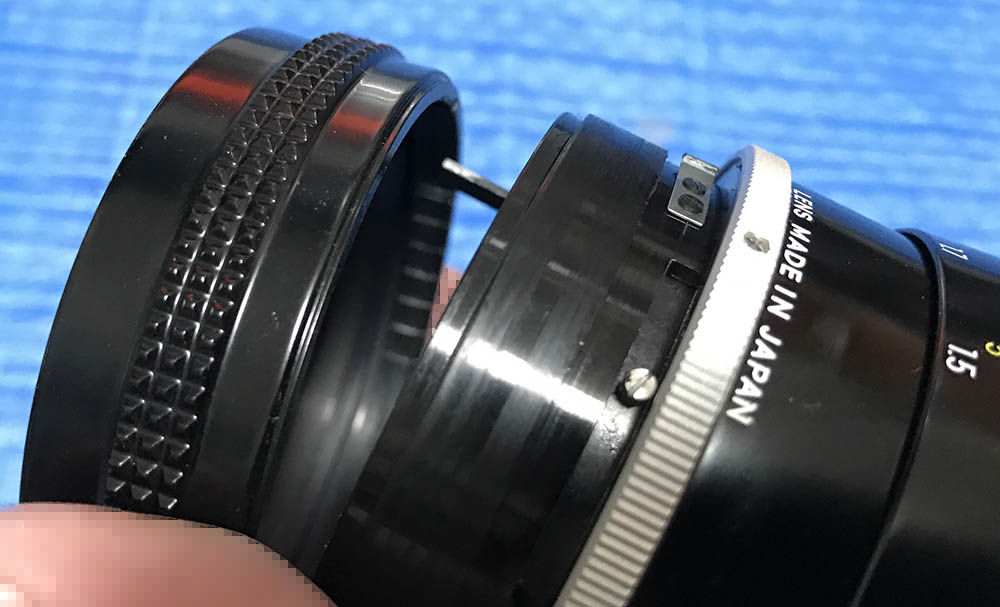 Carefully extract this. It’s a pin that couples the aperture ring to its fork.