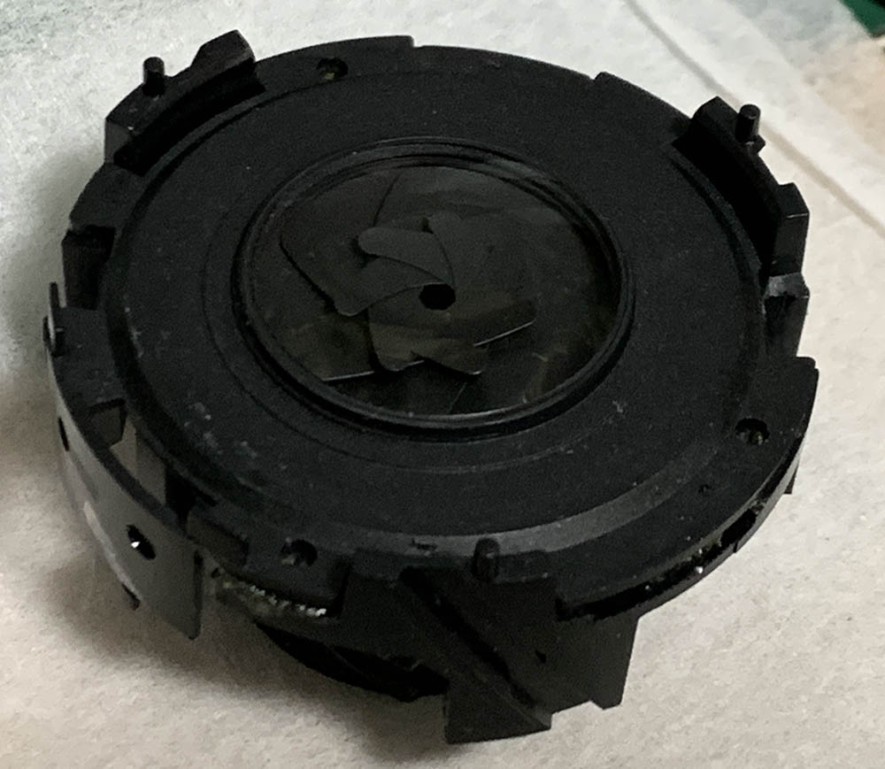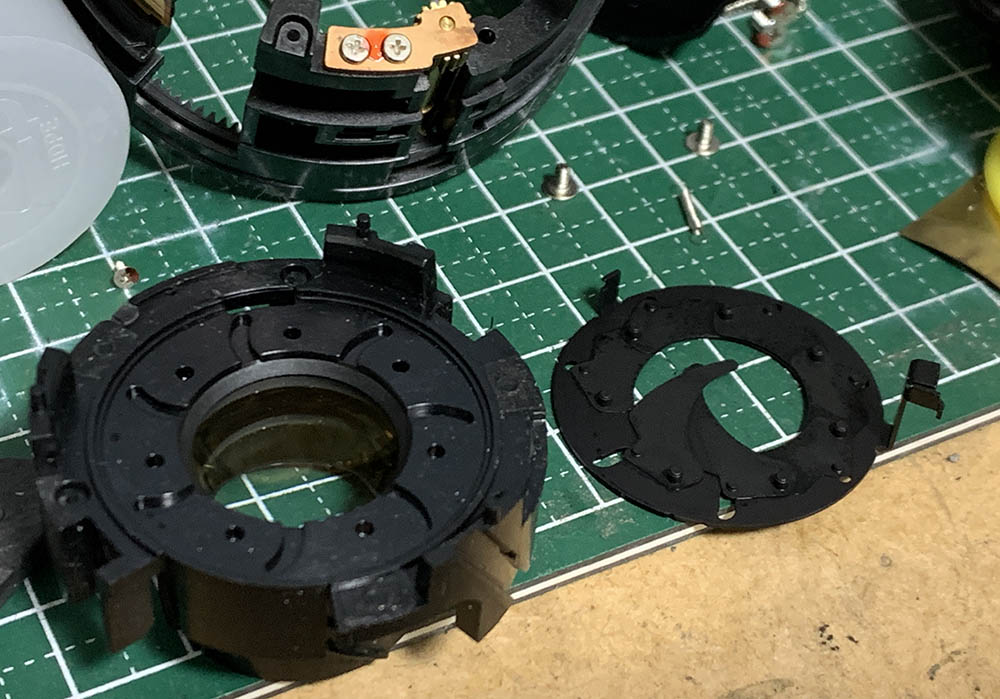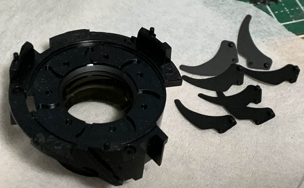 Remove the diaphragm plate to dismantle the iris mechanism. Be careful not to damage the blades, only use a pair of sharp tweezers to handle them by their pins so you won’t bend any of them.