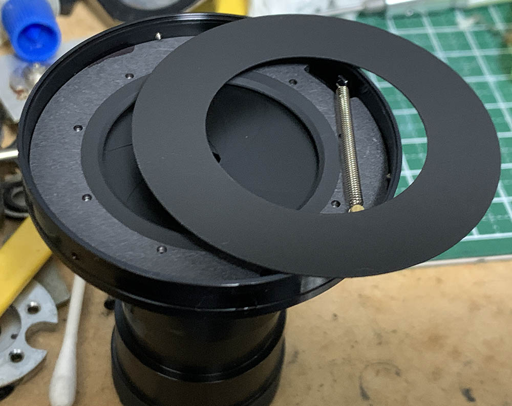 This disc covers the iris mechanism, carefully remove it and never warp it since any damage to this is visible from the front of the lens, magnifying even the smallest flaw.