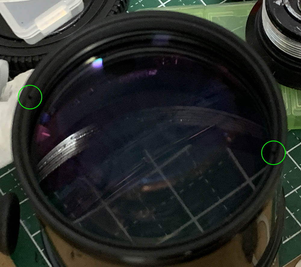 Carefully extract these, heat these with a soldering bold to soften the epoxy used to secure it. These secure the aperture fork inside, it couples the aperture ring to the iris mechanism inside. You couldn’t remove the ring if these screws weren’t extracted.