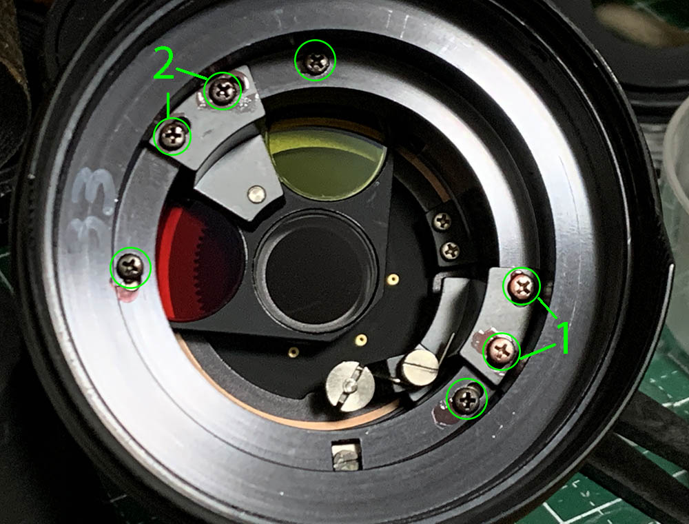 You can now access these screws. Before removing anything, mark the alignment and positions of the assemblies here so you will know how to put these back again later. Extract the screws of the detent mechanism first (#1) to remove it, the lever allows you to click the filters into place. Remove the screws of the carousel next (#2), be careful when removing this assembly to prevent doing any harm to it and the delicate filters. Both the carousel and detent mechanism are usually sealed so applying alcohol to them will help you remove them easier. Finally, extract the 3 screws to remove the housing of the objective.