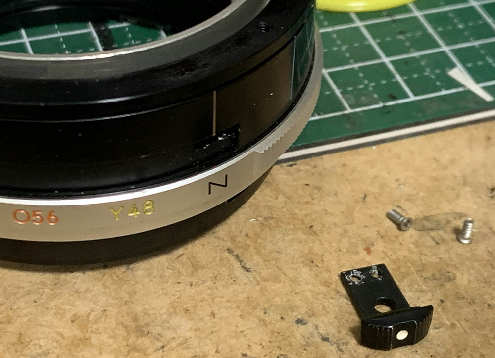 Extract this screw carefully. It couples the aperture ring to its fork so turning it will allow you to regulate the iris.