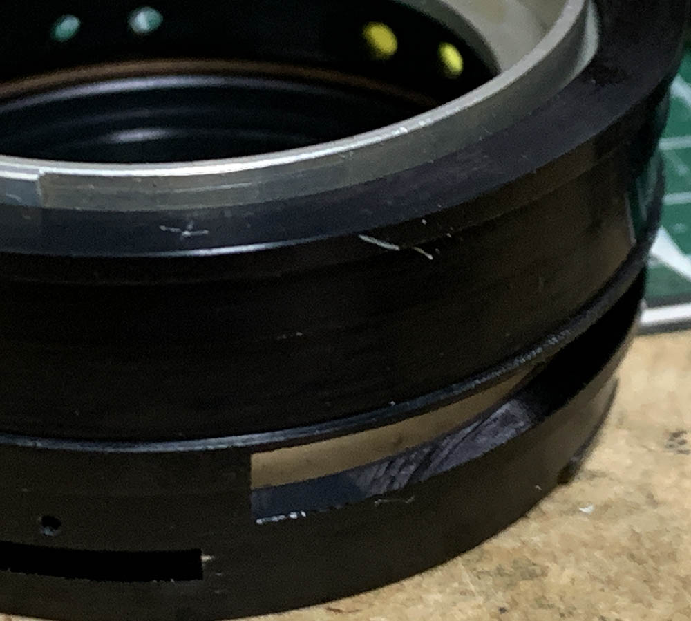 This is how the aperture fork and the carousel’s coupler ring look like. There are slots in both that should couple with small tabs at the objective’s housing’s outer part, be sure to align them properly when putting the objective back into the barrel.