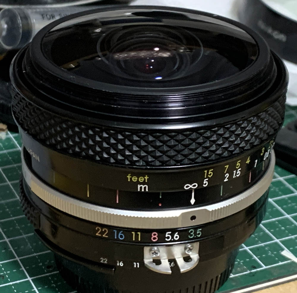 What makes this one special is it has a built-in array of filters. Since it was almost mandatory back then to shoot monochrome film with filters and there were no commercially available ones for these Nikon decided to install one within its barrel just like how the older Fisheye-Nikkors were made. Later ones will allow you to install special ones at the rear, those can easily get misplaced. You can also see that mine came with its special front cap.