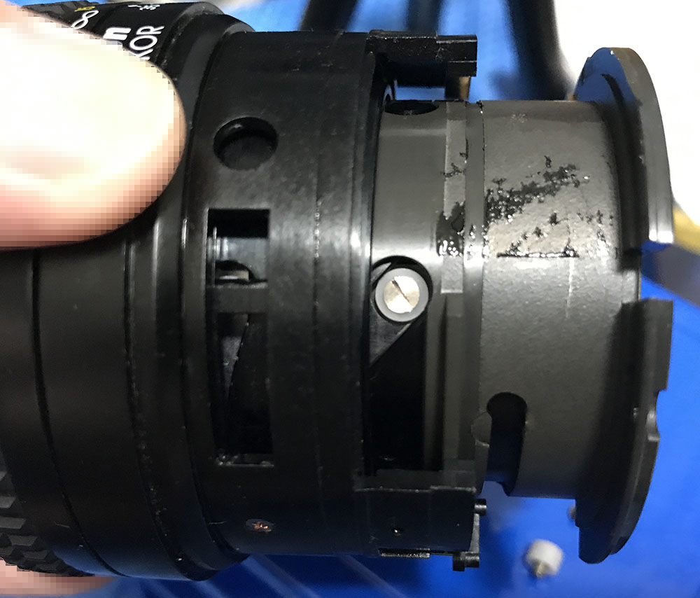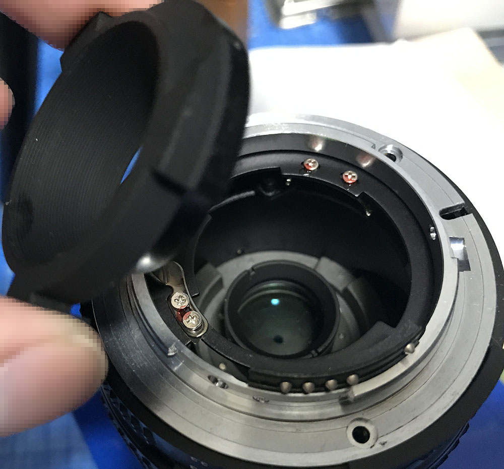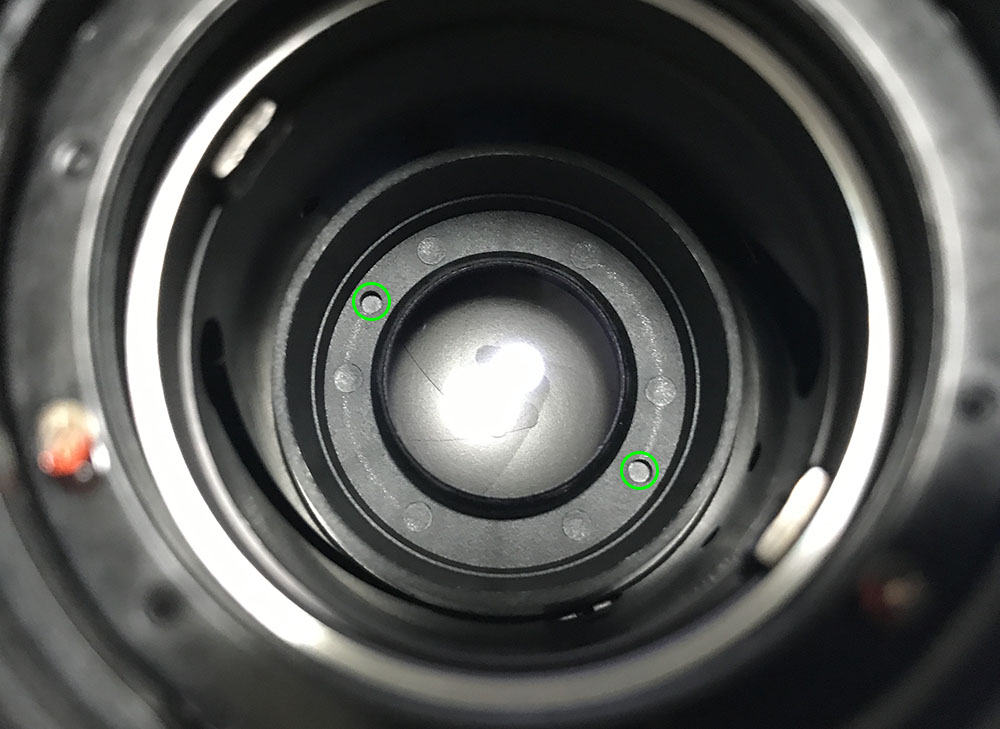 Carefully extract the small screws to remove the baffle. There’s a tall screw at the 6:00 position, it prevents the lens from turning-beyond the mount’s lock, damaging both the lens and the camera. Don’t forget to put it back properly later.