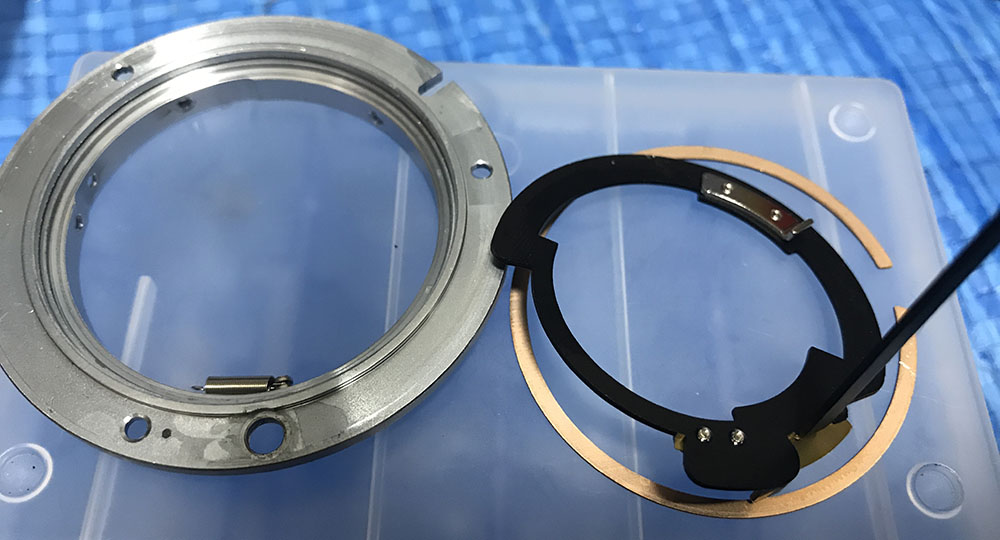 Extract the screws of this ring to remove it, be careful not to misplace anything like the aperture ring’s lock. It has a small spring which can be misplaced easily.