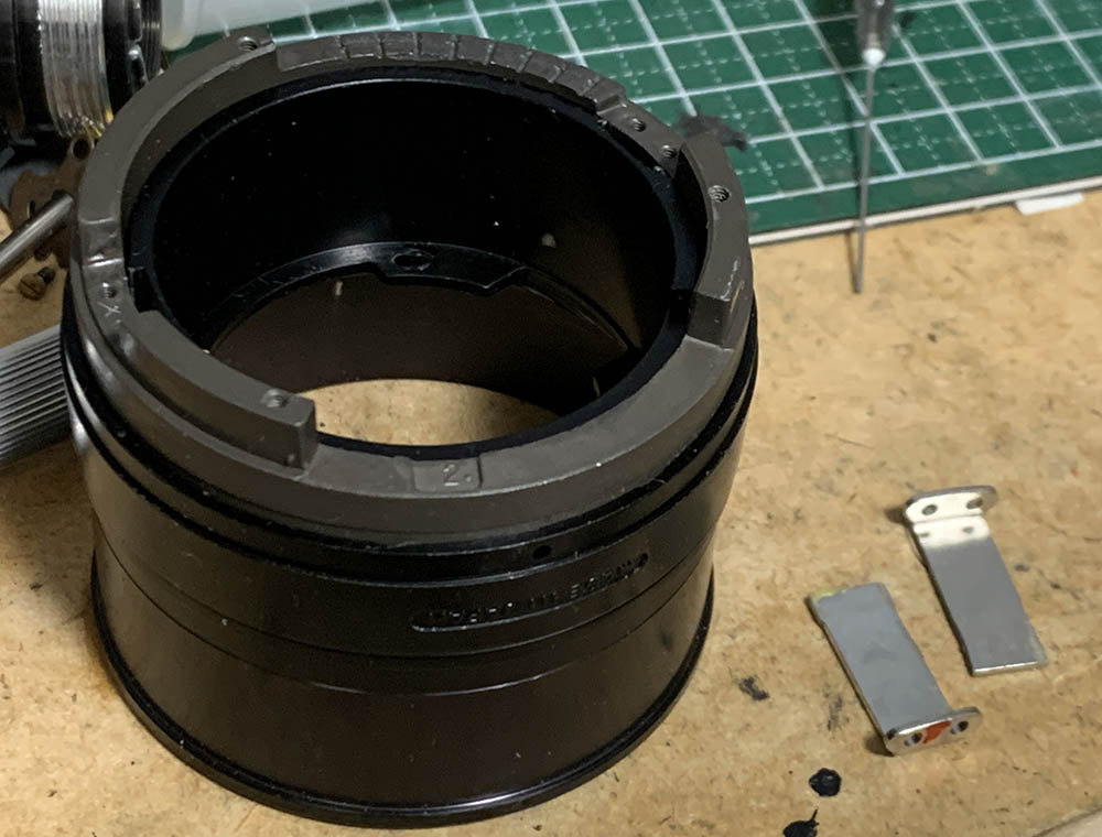 Carefully remove the bayonet mount and be careful not to bend the long stop-down lever’s shaft. It connects to the iris mechanism that sits deep within the objective’s housing.