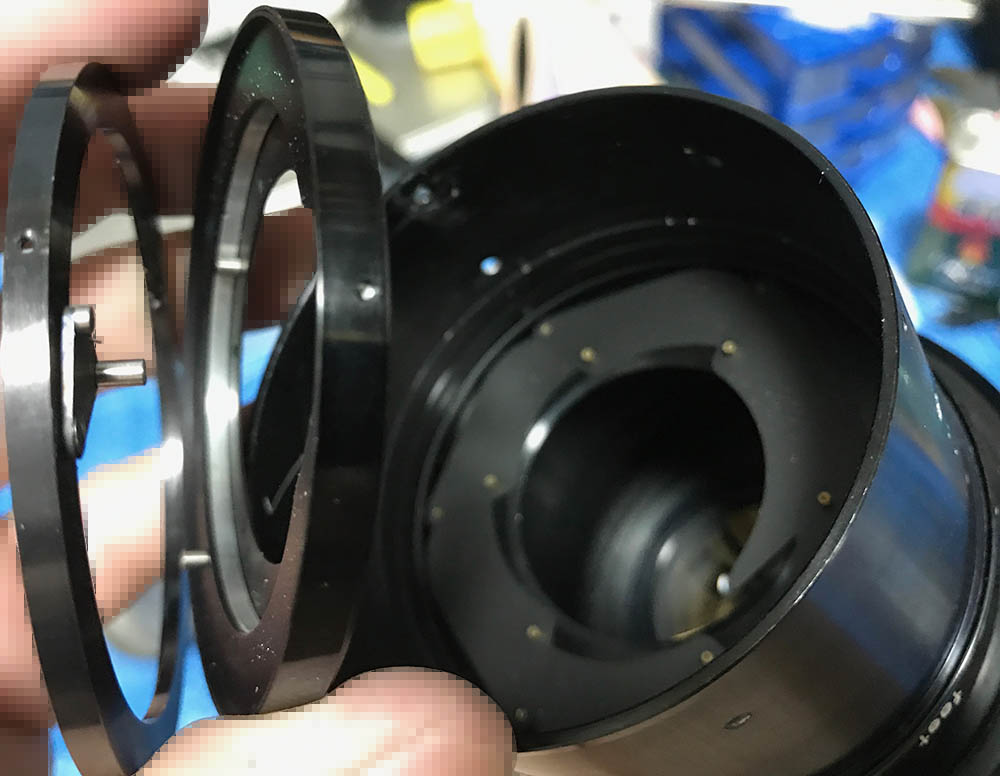 Carefully remove the bayonet mount. Note that there’s a couple of shims here, never misplace or damage any of them since they’re used to adjust the rear-focus.
