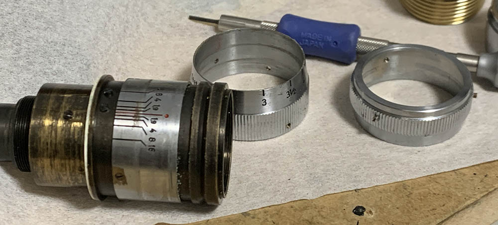 Loosen the screws of the aperture ring to remove it, once it’s gone the focusing ring could be removed as well.