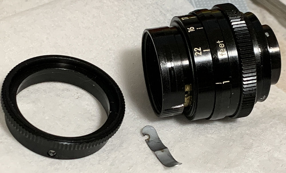 Once the screw is gone you can safely pull the aperture ring off, be careful so you won’t lose the spring. This is used for the click-stops, without it the aperture ring will turn freely.