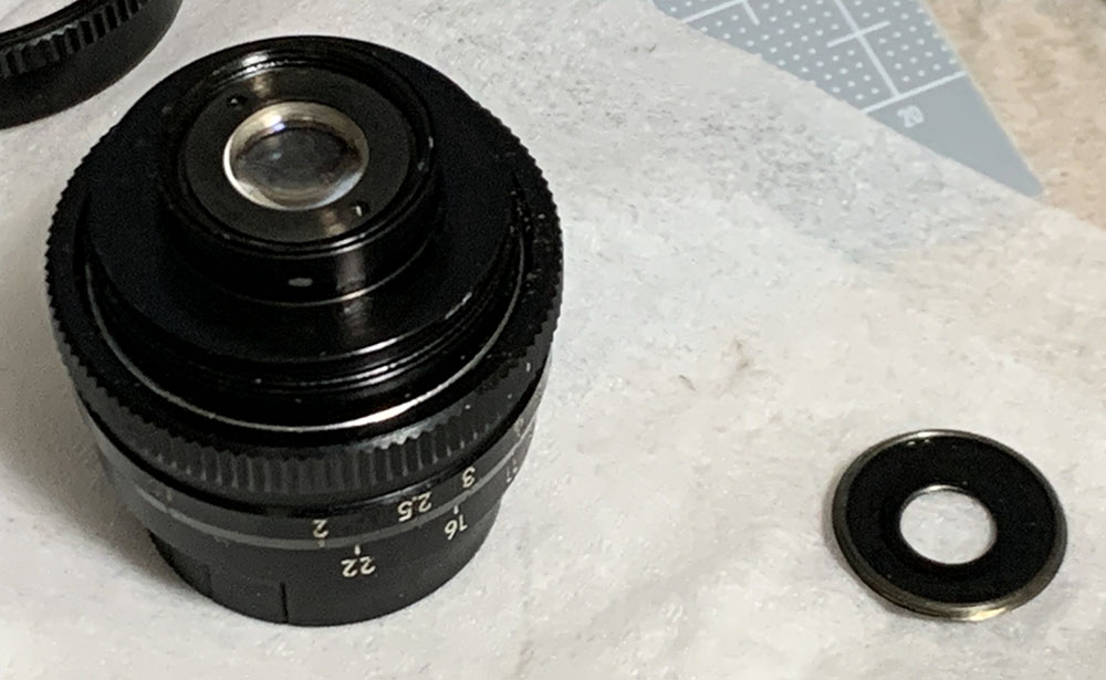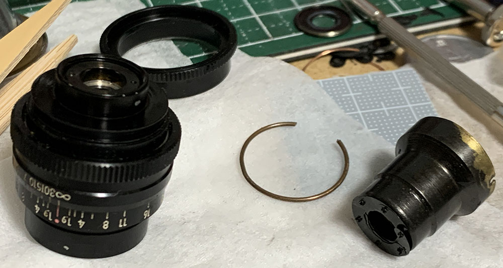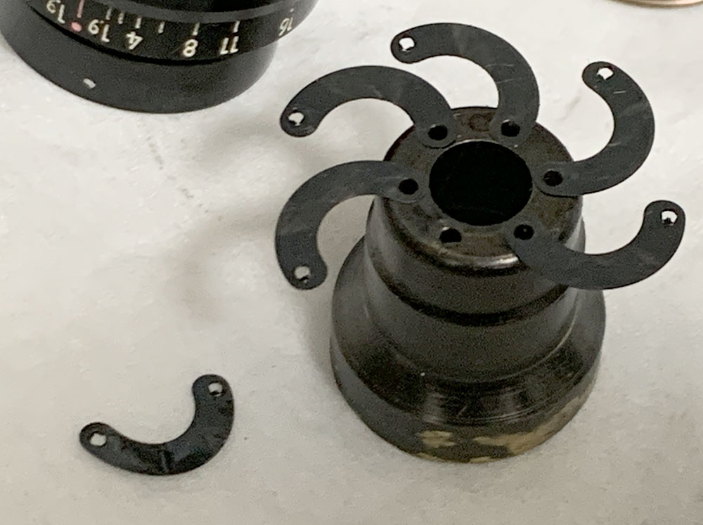 There’s a ring here that secures the iris mechanism, carefully pick it off.