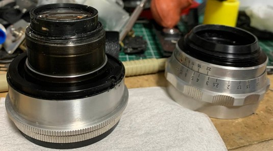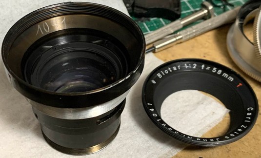 The front elements assembly could be unscrewed. Prevent anything from touching the inner surface of the lens as it’s where the coating is usually situated. Unlike Nikkors, the Germans use coatings that are soft.