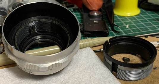 Separate the central helicoid (focusing-ring) from lower one. Mine parted at this point, despite it being a single-entry thread it’s best to be safe.
