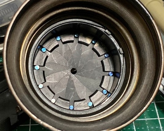 The iris is now clean, it looks pretty now without that thin film of grime that used to coat it. Since there’s nothing that will allow you to adjust its focus apart from the shim shown in the previous section you won’t need to do anything with it if you got everything right.